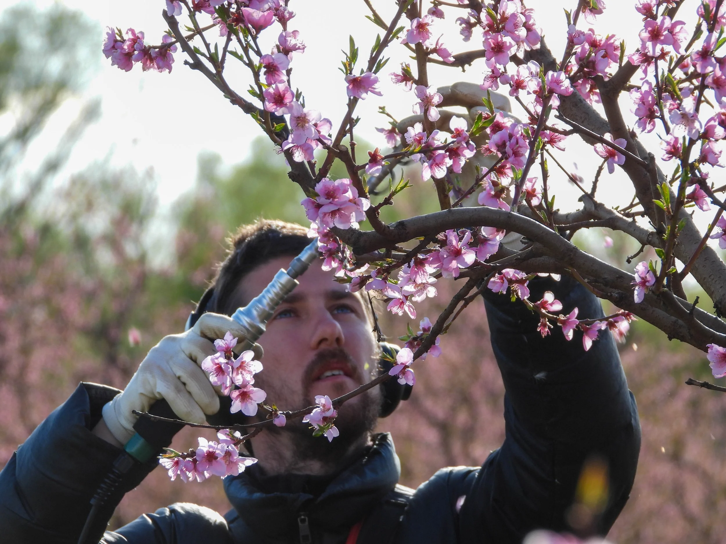 What You Will Do: Remove blossoms from trees using a spinning wand with a rubber loop. This helps the trees grow fewer, but larger, fruits.